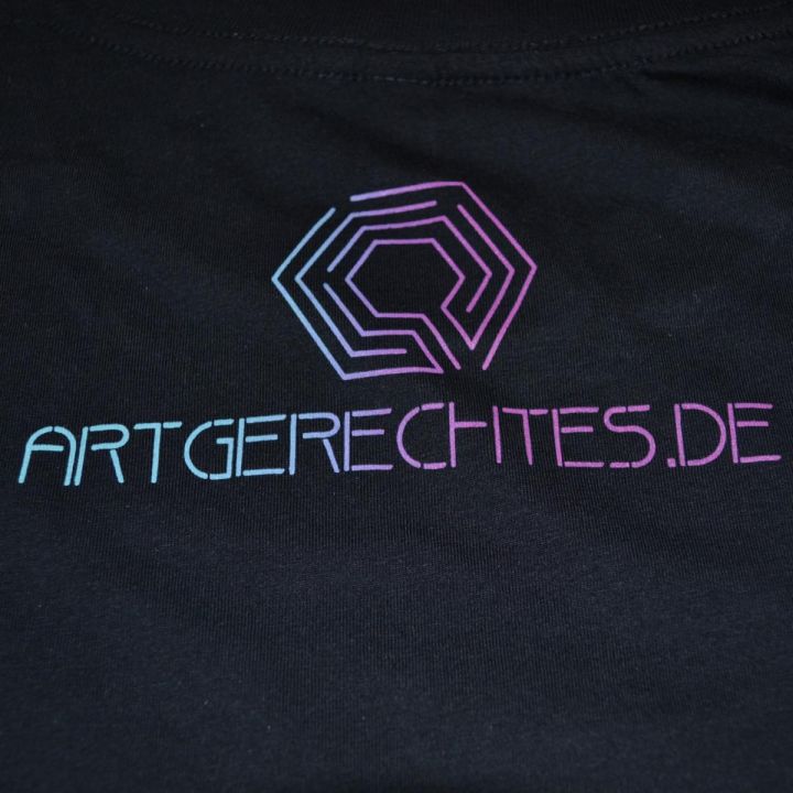 In den Farben magenta/türkis auf schwarzen Shirts.
